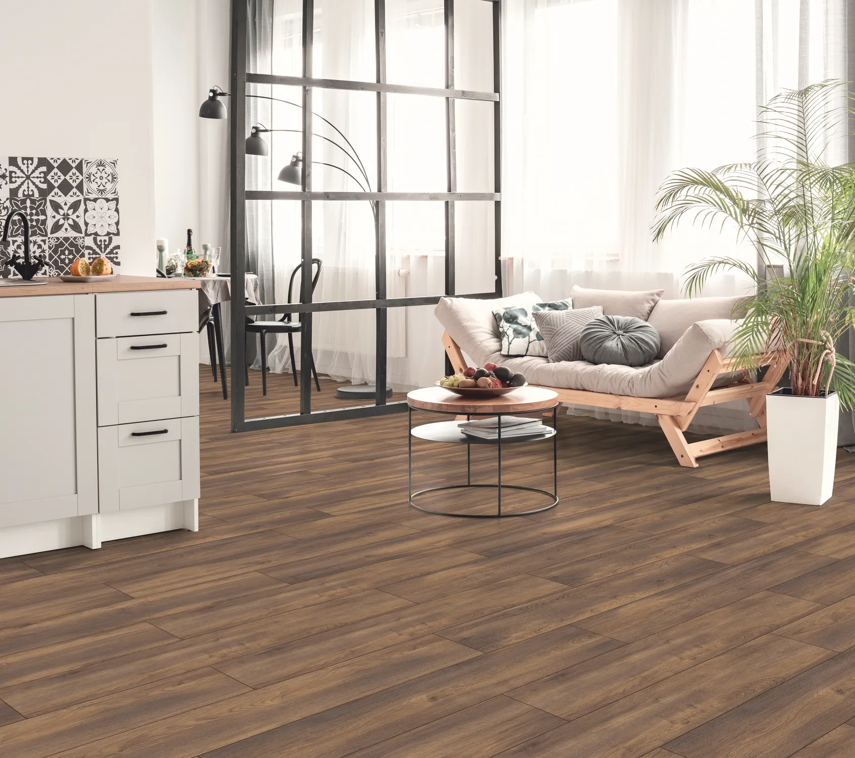 Ламинат Swiss krono Rooms Suite 191 Дуб Эльба коричневый имеет ширину панели 191 мм, длину 1380 мм, АС5 класс прочности, толщину 8 мм и поставляется в упаковках по 8 шт. Одна упаковка содержит 2,109 м2 покрытия. Имейте ввиду: для стандартной укладки необходимо приобретать ламинат с запасом не менее 5%, а при нестандартной укладке (например, диагональ) может потребоваться уже 7 - 12% запаса.